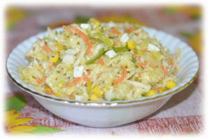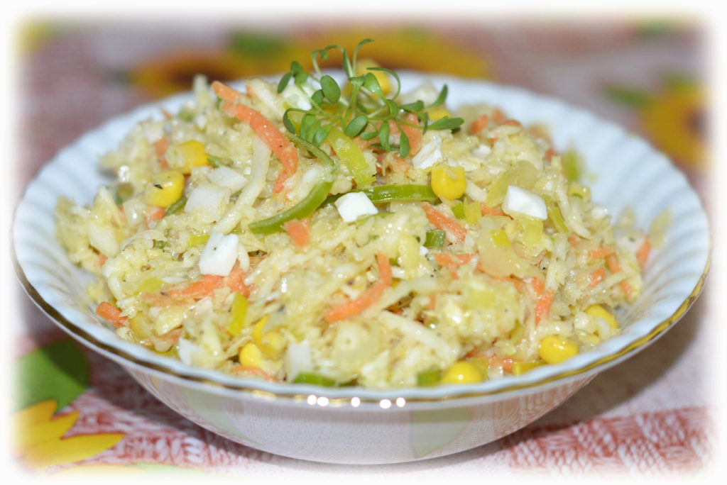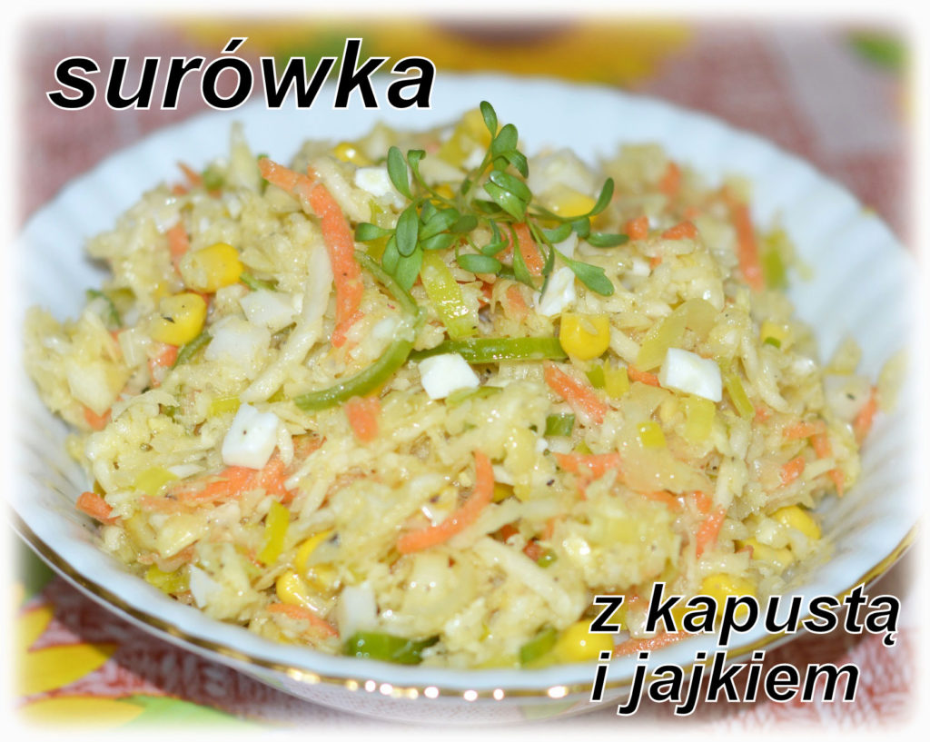 Klasyczna surówka z białej kapusty urozmaicona dodatkiem gotowanego jajka🙂 Doskonale pasuje do ryb, mięs i klasycznych dań obiadowych (klusek, kasz, ryżu, ziemniaków). Przyznam, że nigdy wcześniej nie słyszałam o dodawaniu jajek do surówek, ale… spróbowałam u Teściowej i przekonałam się, że to świetna sprawa😉