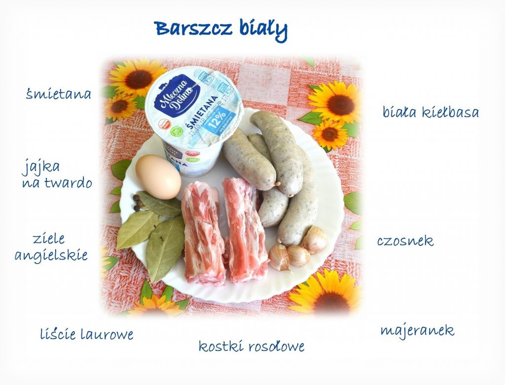 Kości opłucz, włóż do dużego garnka, zalej 2 litrami zimnej wody i zagotuj. Zbierz pianę gromadzącą się na wierzchu (szumowiny). Gotuj 20 minut. Dodaj białą kiełbasę, liście laurowe i ziele angielskie i gotuj kolejne 20 minut (po tym czasie wyłów kiełbasę). Do wywaru dodaj majeranek i czosnek przeciśnięty przez praskę – gotuj przez chwilę. Mąkę i śmietanę połącz ze sobą – wymieszaj z chochlą gorącego wywaru (by się nie zwarzyła), a następnie wlej do zupy i gotuj 5 minut. Przypraw solą, pieprzem i sokiem z cytryny. Gotową zupę podawaj z białą kiełbasą i jajkiem ugotowanym na twardo.