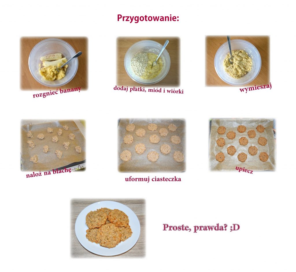 Możesz je jeść bez najmniejszych wyrzutów sumienia😉 Nie zawierają mąki pszennej, tłuszczu, ani cukru – słodyczy dodają ciasteczkom banany i miód. To szczególnie dobre rozwiązanie dla osób, które się odchudzają, lubią zdrowe odżywianie lub przez problemy zdrowotne mają ograniczenia dietetyczne. Ciasteczka są miękkie, ale jeśli chcesz, by chrupały, dodaj orzechy, migdały lub ziarna słonecznika. Są idealne na śniadanie oraz na przegryzkę do szkoły lub pracy. Zapraszam do wypróbowania😉