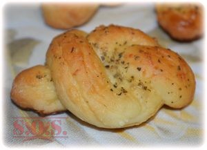 Czosnek przeciśnij przez praskę. Wymieszaj w miseczce z roztrzepanym jajkiem, majerankiem i solą. Odstaw, by składniki „przegryzły się”. Suche drożdże wymieszaj z ciepłym mlekiem, cukrem, solą i olejem. Stopniowo dodając mąkę wyrabiaj ciasto, aż będzie jednolite i gładkie. Miskę lekko posmaruj olejem i przełóż ciasto (łatwiej później odstanie). Przykryj ściereczką i odstaw na 40 minut do wyrośnięcia. Z ciasta odrywaj małe kawałeczki, rozciągaj palcami i zawijaj w supełek. Układaj na blasze wyłożonej papierem do pieczenia i posmarowanej tłuszczem. Pozostaw do ponownego wyrośnięcia na 30 minut. Supełki posmaruj przygotowanym wcześniej jajkiem (najwygodniej użyć silikonowego pędzelka). Piecz ok. 20-30 minut w temp. 180 stopni.