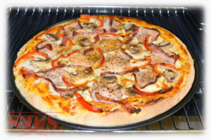 W dużej misce rozmieszaj drożdże z wodą, olejem, cukrem i solą. Mieszając stopniowo wsypuj mąkę, a później zacznij zagniatać suchą dłonią. Gotowe ciasto jest elastyczne i odstaje od rąk. Przykryj je suchą ściereczką i odstaw na bok na ok. 40 minut, by nieco odpoczęło i podrosło. Następnie przełóż je na blachę lub formę wyłożoną papierem i wysmarowaną oliwą lub olejem. Dłońmi uformuj placek delikatnie rozciągając ciasto ku brzegom (jeśli Ci tak wygodniej, możesz je rozwałkować wałkiem). Pozostaw w temperaturze pokojowej jeszcze na 30 minut. Przez ten czas ciasto nieco zwiększy objętość. Wierzch posmaruj sosem pomidorowym, rozłóż drobno pokrojoną mozzarellę, a następnie pozostałe składniki – salami, pokrojone pieczarki, paprykę i boczek. Wstaw do rozgrzanego piekarnika – piecz z termoobiegiem przez 10 minut w temp. 220 stopni.