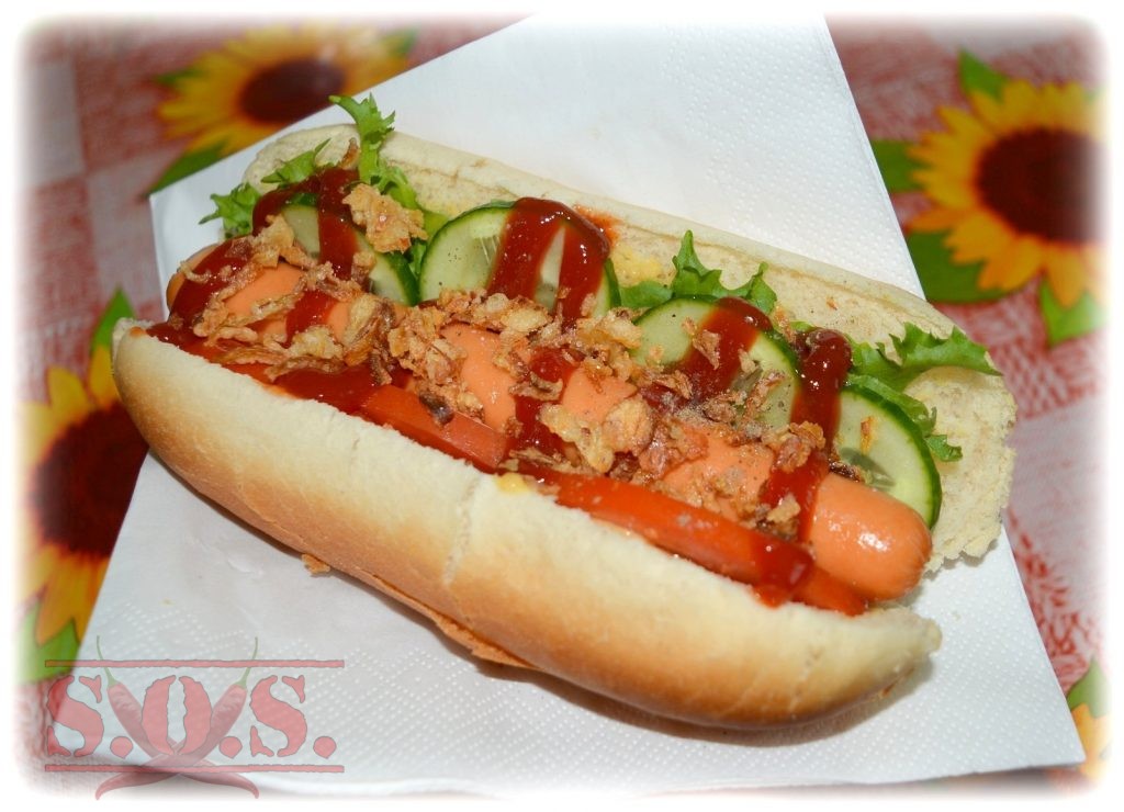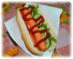 Blachę z piekarnika wyłóż papierem do pieczenia. Bułki natnij wzdłuż, ale nie przecinaj do końca, by „się otwierała”. Na blasze ułóż bułki i parówki (oczywiście bez foliowych osłonek) i wstaw do rozgrzanego piekarnika na 10 minut (temp. 180 stopni). Bułki posmaruj od środka majonezem lub musztardą, następnie do każdej włóż liść sałaty, plasterki pomidora, ogórka i gorącą parówkę. Po wierzchu polej keczupem i posyp prażoną cebulką.