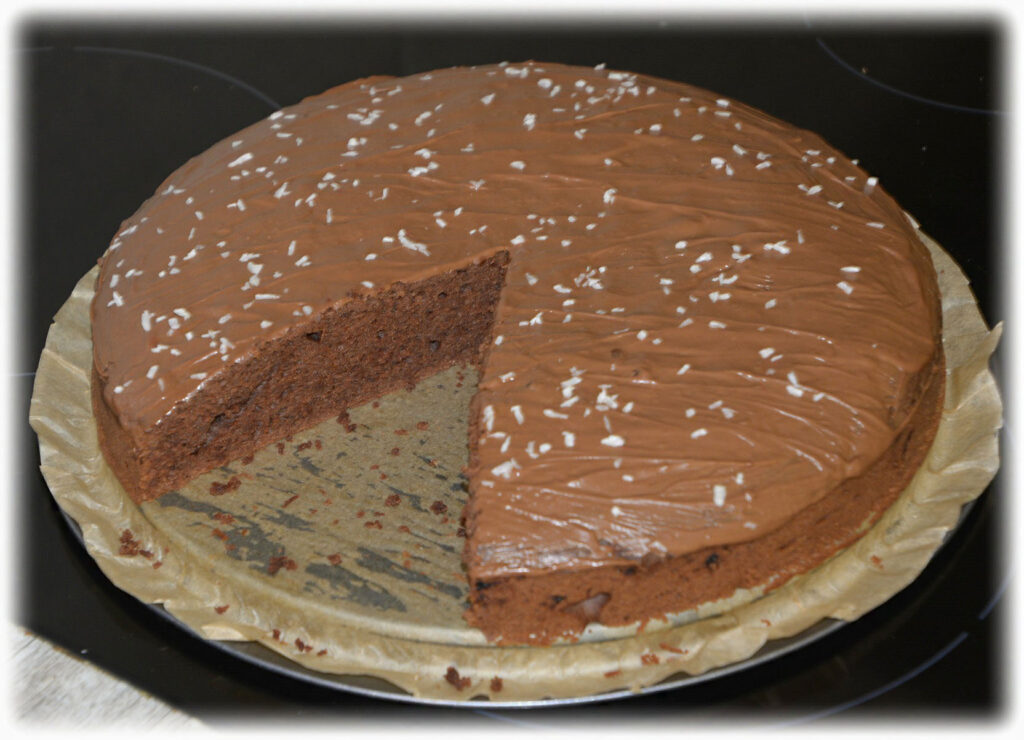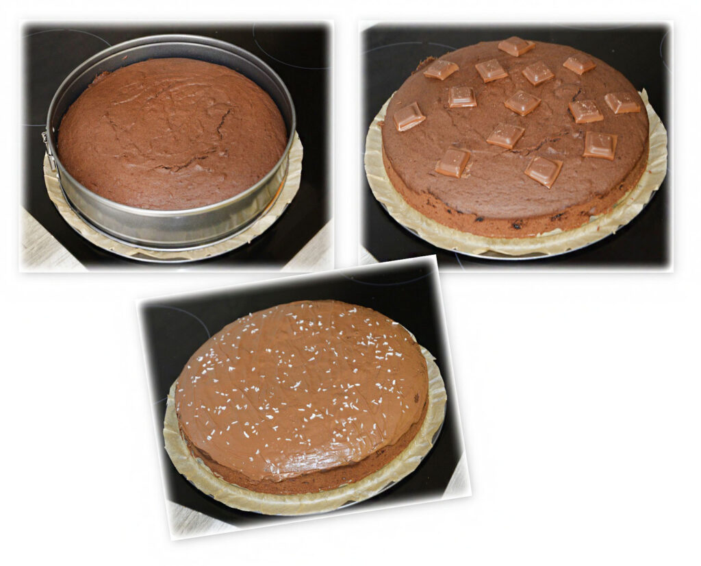 Gdy ciasto się upiecze, wyłącz piekarnik, wysuń ciasto i rozłóż na nim równomiernie kostki mlecznej czekolady. Wsuń je z powrotem do gorącego piekarnika na 3-4 minuty. Następnie wyjmij ciasto i łyżką rozsmaruj po wierzchu rozpuszczoną czekoladę. Możesz dodatkowo posypać wiórkami kokosowymi lub siekanymi orzechami. Pozostaw do ostygnięcia.