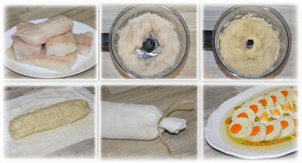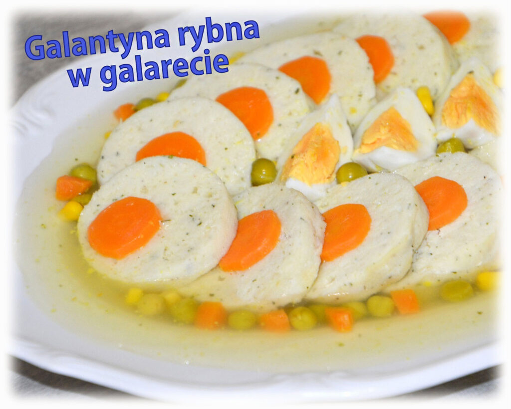 Rybę umyj i osusz. Pokrój na mniejsze kawałki i zmiel maszynką lub rozdrobnij w malakserze. Dodaj pozostałe składniki, dokładnie wymieszaj. Gazę rozłóż na blacie, posmaruj ją masłem. Wyłóż masę, uformuj wałek i zawiń ściśle jak cukierek. Brzegi skręć – zawiąż nitką lub lnianym sznurkiem. Włóż do gotującej się wody i gotuj około 30 minut. Wyjmij galantynę na talerz lub półmisek, by ociekła z wody. Bez rozwijania pozostaw do ostygnięcia. Po ostudzeniu rozwiń i pokrój na plastry. Ułóż je na półmisku, udekoruj pokrojoną ugotowaną marchewką, groszkiem i kukurydzą – zalej przygotowaną galaretą. Wstaw do lodówki, by stężała.