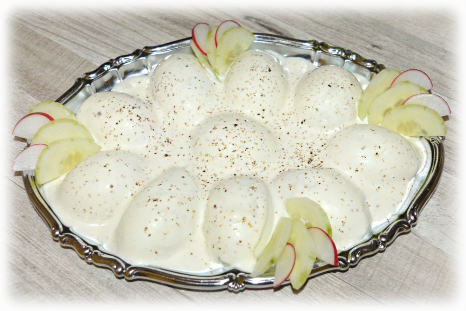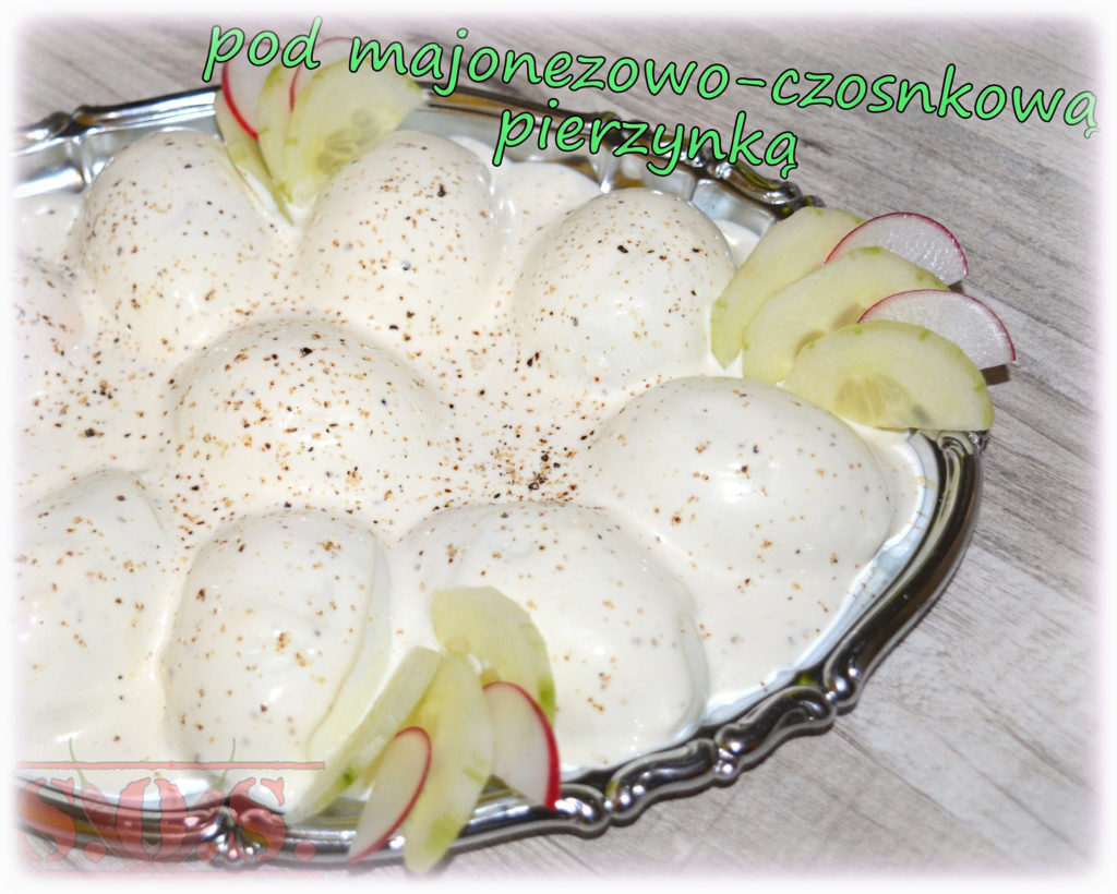 Obłupione ze skorupki jajka przekrój na połówki i poukładaj na talerzu przekrojoną stroną do dołu. Majonez wymieszaj ze śmietaną, mlekiem i czosnkiem przeciśniętym przez praskę. Dopraw do smaku sola i pieprzem. Za pomocą łyżeczki pokryj sosem jajka. Gotowe danie przechowuj w lodówce (lub chłodnym miejscu).
