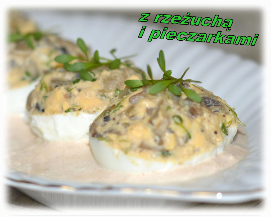 Cebulę pokrój w drobną kosteczkę i zeszklij na patelni. Dodaj posiekane pieczarki – smaż bez przykrycia przez około 5 minut. Zdejmij z ognia i odstaw do przestudzenia. Jajka obłup ze skorupki, opłucz. Przekrój na połówki. Wyjmij z nich żółtka, drobno posiekaj, a następnie dodaj do pieczarek razem z rzeżuchą – całość wymieszaj. Na końcu dodaj majonez oraz dopraw do smaku. Gotowym farszem napełnij białka jajek. Ułóż je na talerzu i jeśli chcesz, udekoruj dodatkowo rzeżuchą.