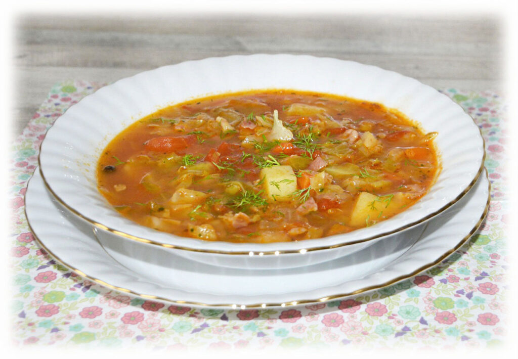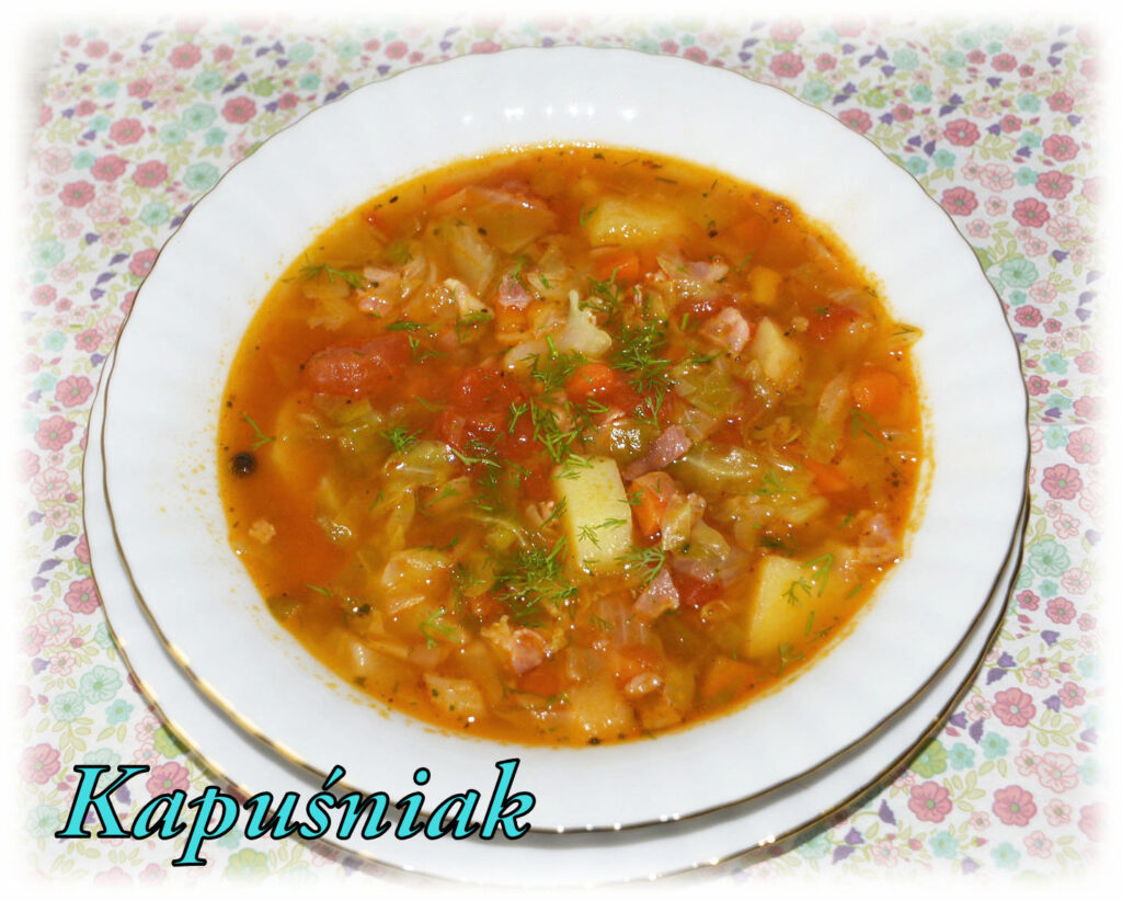 Wspaniała domowa zupa sezonowa z młodą kapustą i warzywami😉 Wędzony boczek nadaje jej ładnego apetycznego aromatu. Idalna do podania na obiad lub lekką kolację. Jeśli chcesz, możesz wzbogacić kapuśniak większą ilością warzyw dodając pora, korzeń selera lub pietruszki.