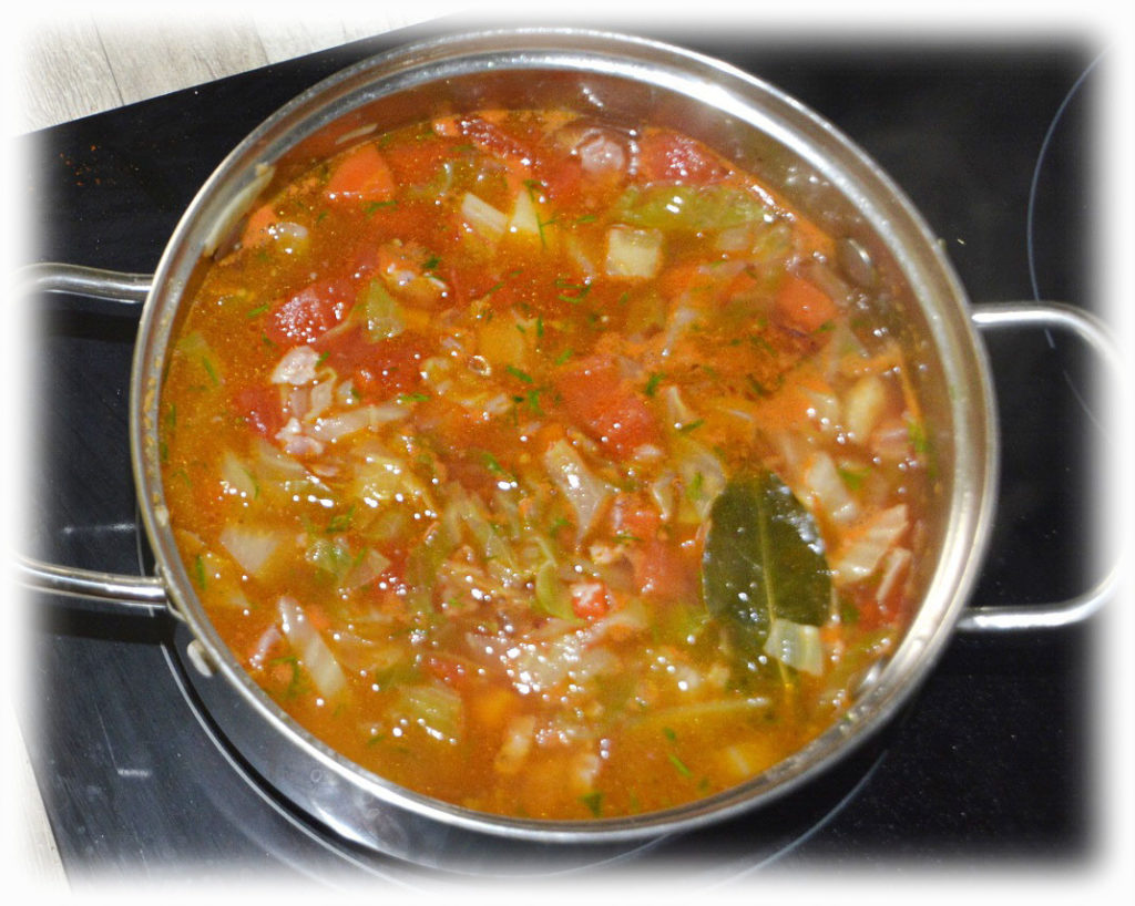 W rondlu rozgrzej tłuszcz. Wrzuć cebulę i boczek pokrojone w kostkę – podsmaż tak, by cebula była zeszklona. W tym czasie kapustę przekrój, wytnij głąb i posiekaj w cienkie paski. Wsyp ją do rondla, całość przemieszaj łyżką (najlepiej drewnianą, by nie porysować dna). Przykryj pokrywką i duś chwilę na niedużym ogniu (kapusta nieco zmięknie i zmniejszy objętość). Obierz ziemniaki i marchewkę. Pokrój je w kostkę. Przełóż do rondla, wrzuć liście laurowe, ziele angielskie i wlej około półtora litra wody lub bulionu. Gotuj przez 10-15 minut, aż wrzucone warzywa zmiękną. Następnie dodaj pokrojone na mniejsze części pomidory oraz posiekany koperek. Dla smaku dopraw zupę przyprawami: solą, pieprzem, papryką w proszku i cukrem/miodem. Gotuj jeszcze 2-3 minuty, a następnie zdejmij z ognia.