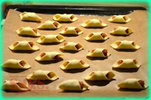 Kabanosy pokrój na mniejsze kawałki, a ciasto francuskie na małe kwadraty. Na każdym kwadracie połóż kawałek kabanosa, zlep rogi i ułóż na blasze wyłożonej papierem do pieczenia. Wstaw do rozgrzanego piekarnika i piecz 15 minut w temperaturze 200 stopni.
