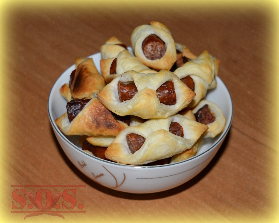 Smaczna i szybka przekąska z kabanosów i ciasta francuskiego. Świetna przegryzka do filmu lub na imprezę. Można je wcinać same bez dodatków lub z dipem (np. czosnkowym).