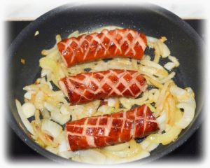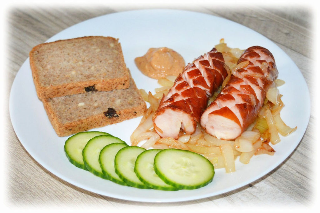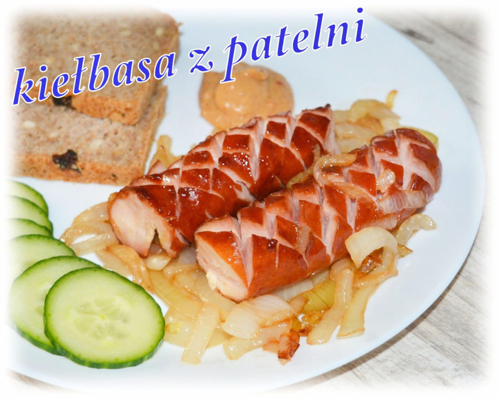 Rumiana i aromatyczna kiełbasa z podsmażoną cebulą. Banalnie proste smaczne danie, które można zjeść na kolację lub podać do obiadu🙂 Pasuje do niej pieczywo, jak również ziemniaki i surówka.