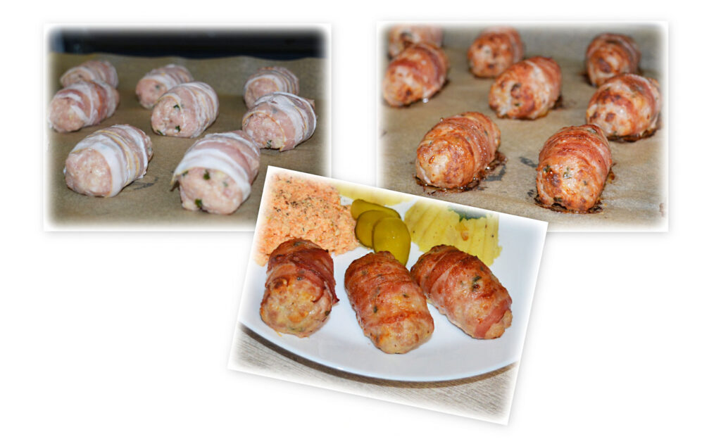 Bułkę namocz na chwilę w wodzie i odciśnij dłonią. Przełóż do większej miski i rozdrobnij (ja to robię spiralnym ubijakiem do ziemniaków🙂). Dodaj pozostałe składniki kotletów – mięso mielone, jajko, posiekaną cebulę, czosnek przeciśnięty przez praskę, bułkę tartą, mąkę oraz przyprawy. Całość dobrze wymieszaj. Z mięsnej masy formuj nieduże wałeczki (rób to mokrymi dłońmi – wtedy masa mięsna nie będzie kleić się do skóry). Plastry boczku rozłóż (np. na desce do krojenia), na brzeg każdego połóż wałeczek mięsa i zawiń. Ułóż je na blaszce wyłożonej papierem do pieczenia. Wstaw do rozgrzanego piekarnika i piecz około 35-45 minut w temperaturze 180 stopni, aż się zarumienią (im większe kotlety, tym dłuższy czas pieczenia).