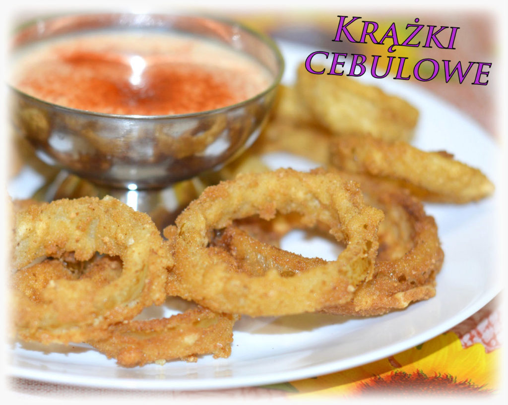 Cebulę obierz z łupiny i pokrój na grube plastry (około 0,5-1 cm). Rozdziel je na pojedyncze pierścienie. Środek i mniejsze części cebuli odłóż do wykorzystania w innej potrawie. W misce umieść wodę, mąkę, jajko, proszek do pieczenia i przyprawy – wymieszaj łyżką lub rózgą do ubijania, aż składniki się połączą. Ciasto powinno mieć gęstość kwaśnej śmietany – nie powinno ściekać z cebuli (jeśli ścieka, dodaj jeszcze trochę mąki i wymieszaj). Krążki cebuli zanurzaj w gotowym cieście, następnie panieruj w bułce tartej i układaj na deseczce/talerzu. W głębokiej patelni lub dużym rondlu rozgrzej większą ilość oleju (tyle, by krążki były zanurzone przynajmniej do połowy). Smaż z obu stron na złoty kolor. Jeśli masz frytkownicę, możesz usmażyć je na głębokim tłuszczu bez odwracania (tak, jak frytki). Usmażone wyjmuj na talerz wyłożony papierowym ręcznikiem (wchłonie ociekający nadmiar tłuszczu).