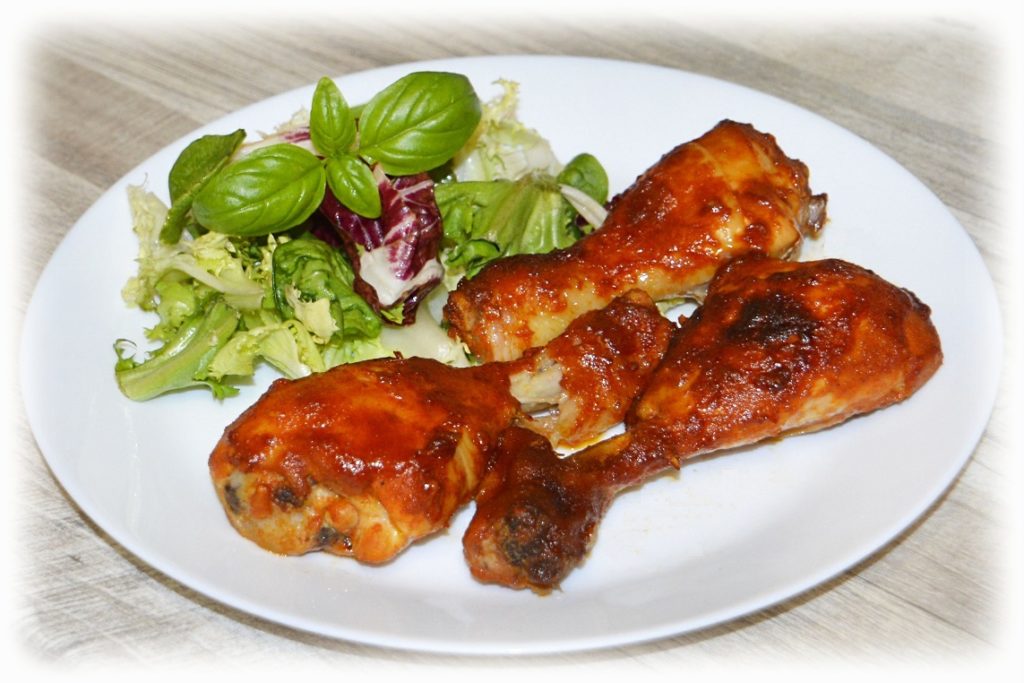 Kurczak palce lizać!😃 Miękkie soczyste mięso upieczone w smakowitym sosie. Posmakuje Twojej rodzinie lub zachwyci gości, którzy przyjdą do Ciebie na obiad. Zamiast kupować gotowy sos barbecue, zrobiłam domową szybką wersję z keczupem i miodem. Upiekłam podudzia, ale w ten sposób możesz przygotować dowolne części kurczaka (udka, skrzydełka, filety, ćwiartki)😉