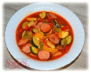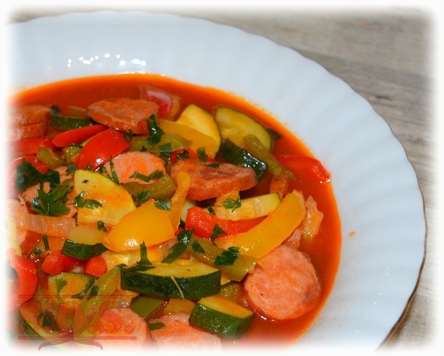 W rondlu rozgrzej tłuszcz. Wrzuć kiełbasę i cebulę pokrojone w kostkę – smaż je przez chwilę. W tym czasie pokrój w dużą kostkę paprykę i cukinię. Dodaj je do rondla i wlej ok. 200 ml wody. Całość duś pod przykryciem na niedużym ogniu. Gdy warzywa będą miękkie, dodaj koncentrat pomidorowy i dla smaku dopraw papryką w proszku oraz solą. Gotuj jeszcze przez 2 minuty, następnie zestaw z ognia.