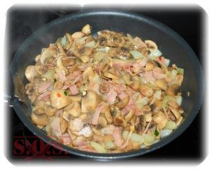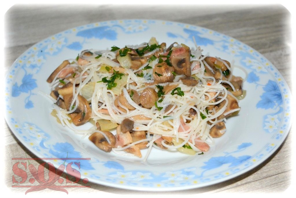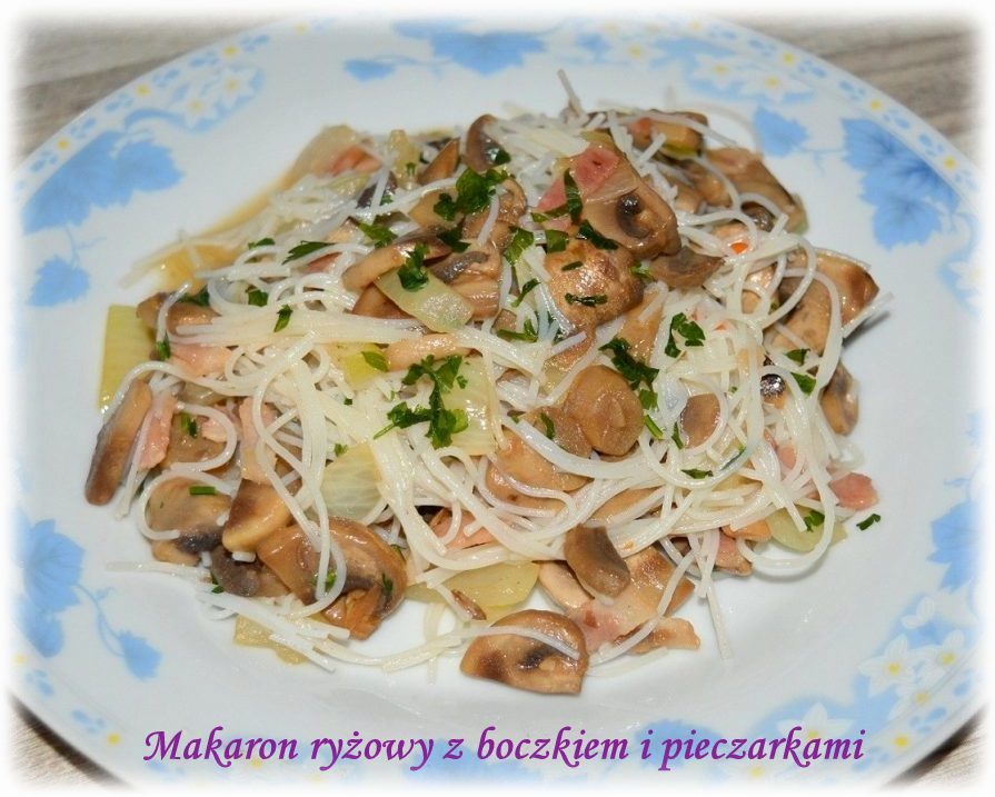 Makaron ryżowy przełam dłońmi na pół (by później łatwiej się wymieszał z pozostałymi składnikami) i włóż do miski lub rondelka. Wodę zagotuj tak, jak na herbatę – zalej nią makaron. Pozostaw na 5-7 minut, by zmiękł, a następnie przecedź w durszlaku. Na patelni rozgrzej tłuszcz, wrzuć pokrojoną cebulę i boczek. Podsmaż. Następnie dodaj pokrojone pieczarki i smaż dalej pod przykryciem. Chwilę przed zdjęciem z ognia dodaj sos sojowy i sos chili. Zawartość patelni przełóż do rondla z makaronem i wymieszaj. Po nałożeniu na talerz posyp po wierzchu siekaną natką pietruszki lub prażoną cebulką.