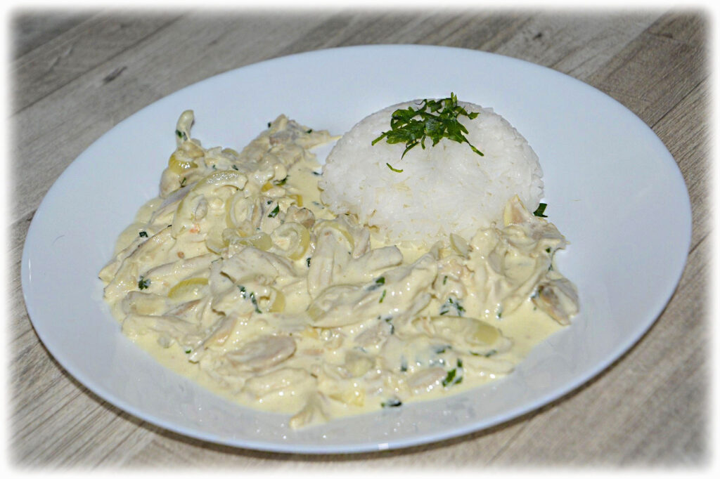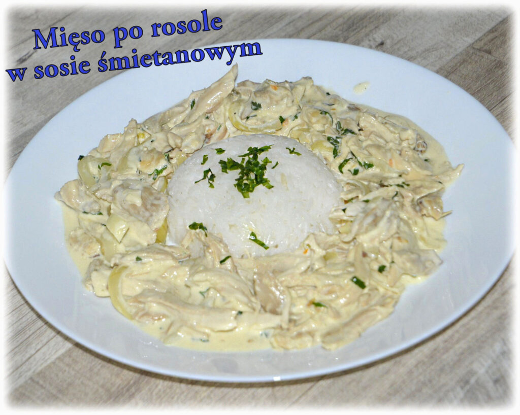 Mięso wyjęte z rosołu oddziel od kości, rozdrobnij palcami. Na patelni rozgrzej tłuszcz. Najpierw zeszklij pokrojoną cebulkę, a później dodaj mięso. Całość podsmaż chwilę, po czym wlej śmietankę, dodaj przyprawy i posiekaną natkę. Gotuj na małym ogniu – po kilku minutach śmietanka zacznie gęstnieć tworząc sos. Podawaj zaraz po przygotowaniu.