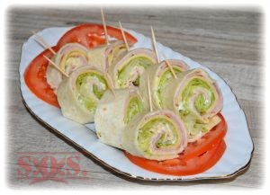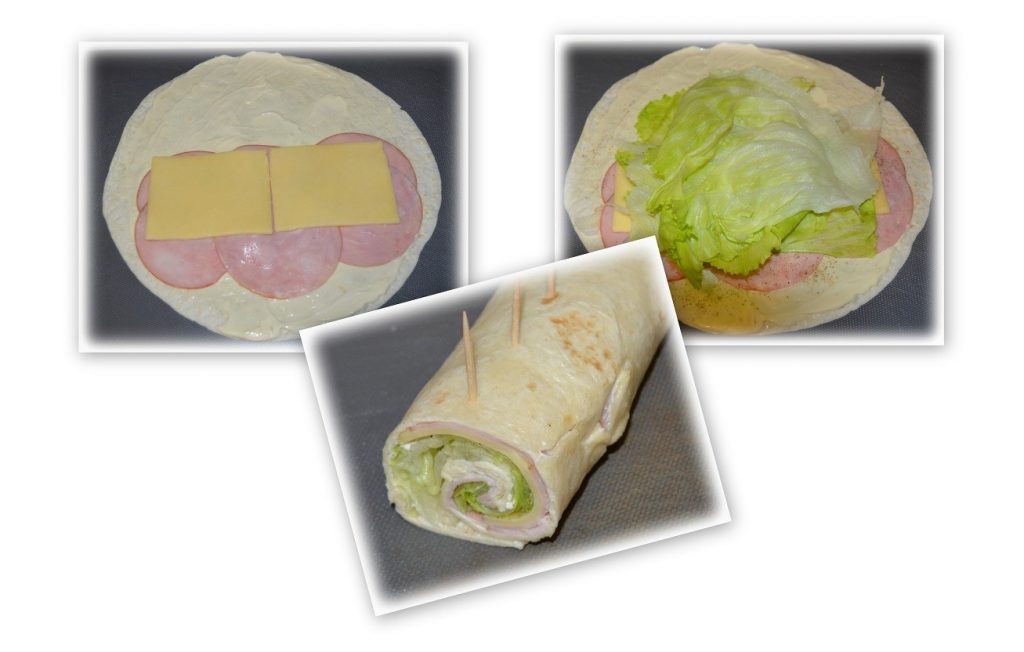 Na talerzu rozłóż placek tortilli, posmaruj serkiem, posyp solą i pieprzem, następnie połóż szynkę, ser i sałatę lodową. Całość zawiń w rulon. Możesz jeść zaraz po przygotowaniu lub zawinąć w folię spożywczą i odłożyć do lodówki.