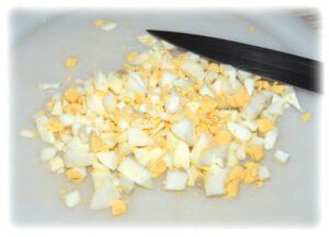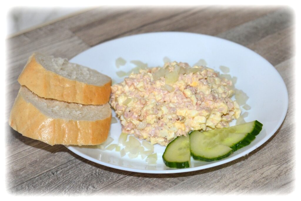 Jajka ugotuj na twardo – ostudź i obłup ze skorupki. Posiekaj je oraz konserwę mięsną. Dodaj szczypiorek, majonez oraz przyprawy. Całość wymieszaj.