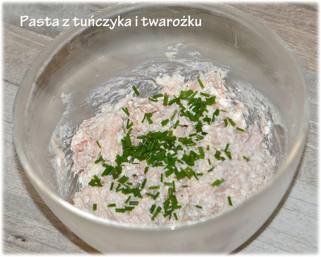 Twaróg i jogurt umieść w miseczce – rozgnieć je widelcem. Następnie dodaj odcedzonego oraz rozdrobnionego widelcem tuńczyka. Dopraw do smaku solą i pieprzem. Całość dokładnie wymieszaj.