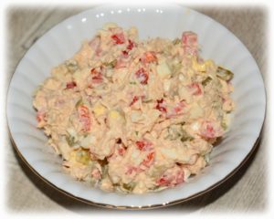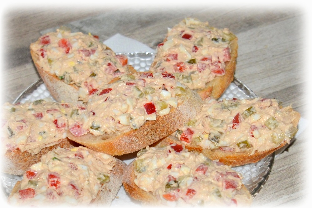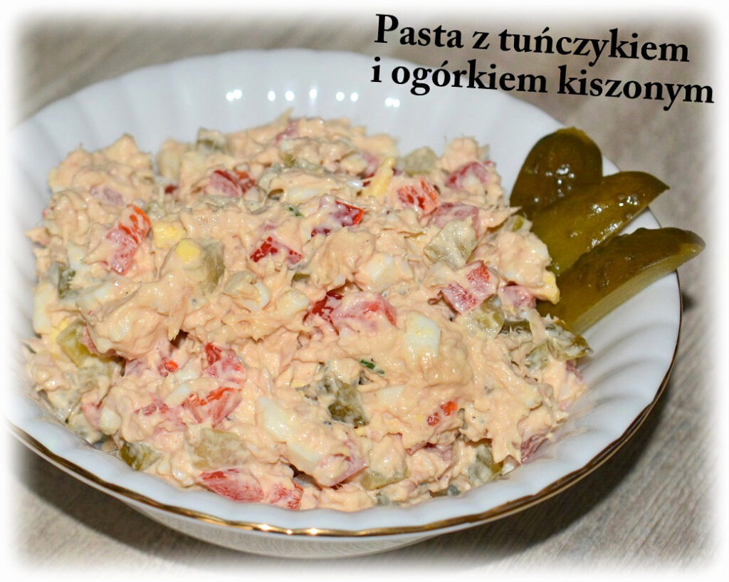 Jajka ugotuj na twardo, ostudź i obierz ze skorupek. Tuńczyka odcedź z zalewy, a następnie rozdrobnij widelcem. Jajka, ogórki, paprykę, cebulę i szczypiorek drobno posiekaj – dodaj tuńczyka i majonez. Dopraw solą i pieprzem – całość dobrze wymieszaj.