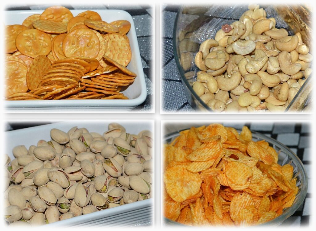 - Przekąski ze sklepu – tu najczęściej bywają wybierane paluszki, krakersy, orzeszki (fistaszki, pistacje, nerkowce), mieszanka studencka, chipsy, chrupki, popcorn, andruty, chipsy bananowe.