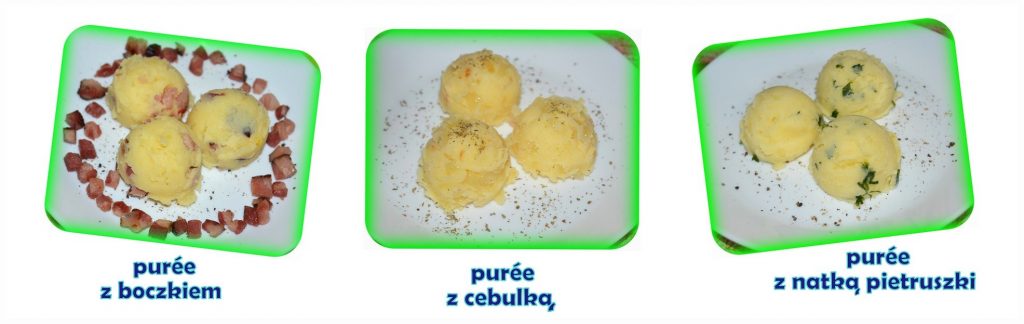 2. Możesz zrobić również purée z… boczkiem smażonym, cebulą duszoną, tartym chrzanem, serem żółtym (parmezanem, goudą), szpinakiem, porem, czosnkiem, natką pietruszki, koperkiem, bazylią, tymiankiem, rozmarynem, kolendrą, gałką muszkatołową.