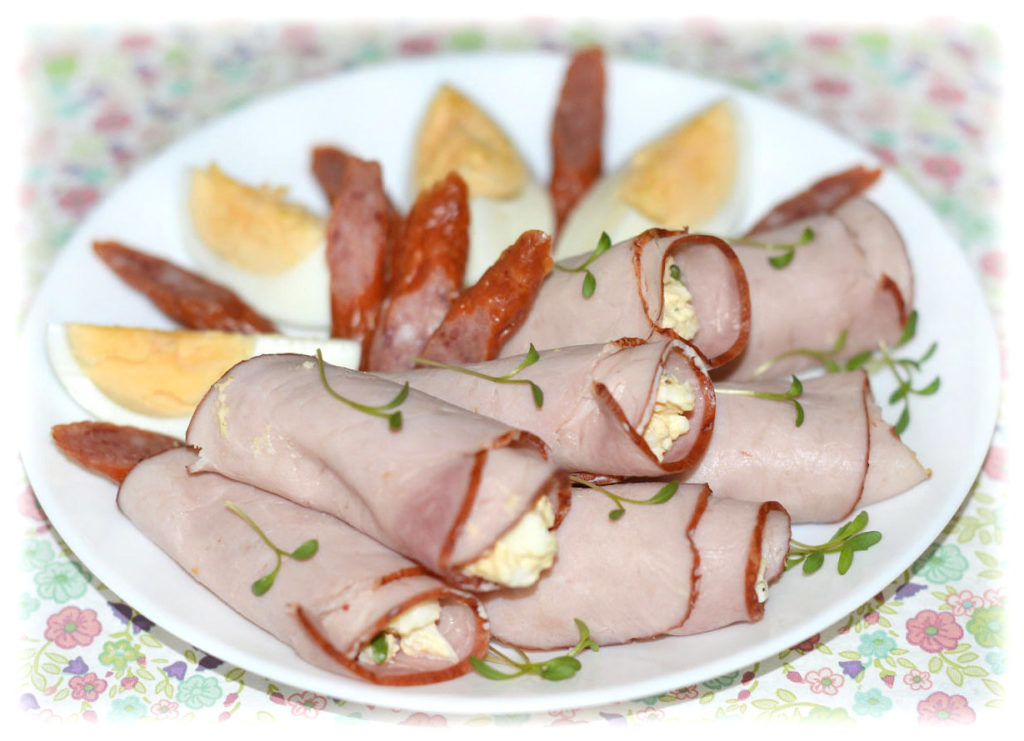 Prosta zimna przekąska zrobiona z szynki oraz pasty jajecznej🙂 Są szybkie, smaczne, łatwe – doskonałe na poczęstowanie gości lub do podania na większej imprezie. Wielkość ruloników zależy od wielkości i grubości plastrów szynki. Zamiast szynki można użyć plastrów polędwicy, baleronu lub salami. W poniższym przepisie znajdziesz skład na 6 rulonów – jeśli potrzebujesz większej ilości, proporcjonalnie zwiększ również ilość składników.