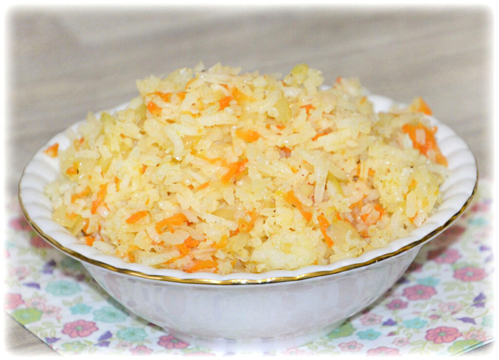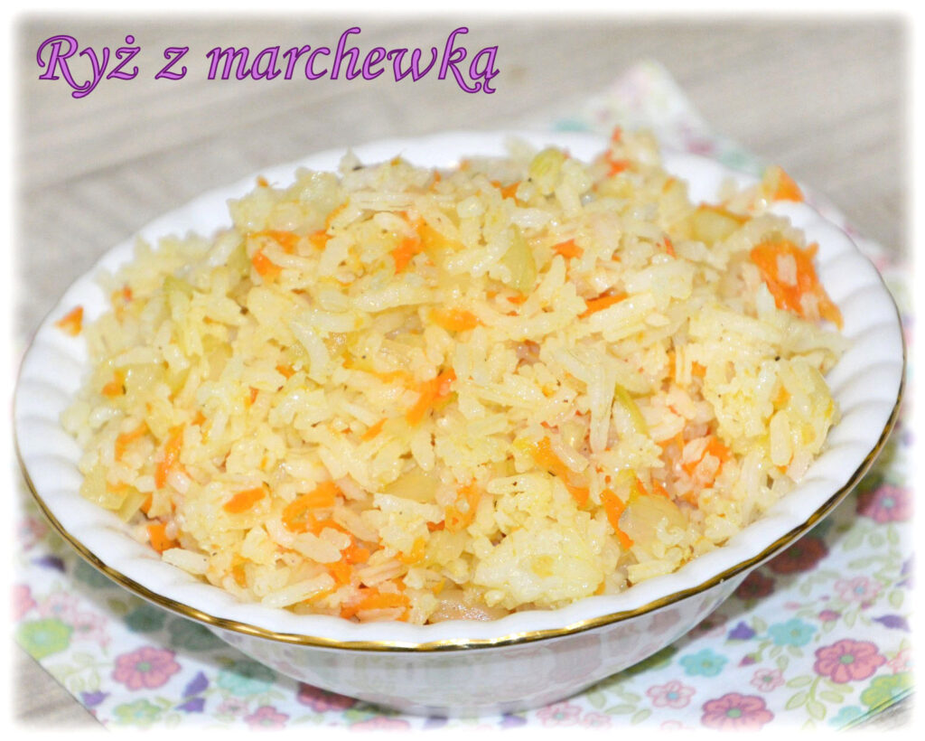 Jeśli lubisz gotowany ryż do obiadu, spróbuj urozmaicić go dodatkiem cebulki i marchewki😉 Jest smaczny, pożywny i lekki dla żołądka. Doskonale pasuje do ryb oraz mięs (np. pieczonego kurczaka, kotletów). Dodatkowo można go zabarwić kurkumą, szafranem lub doprawić curry (to zależy od gustu). Poniżej podaję składniki na 2 porcje, ale możesz je proporcjonalnie zwiększyć, zależnie od swoich potrzeb.