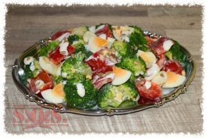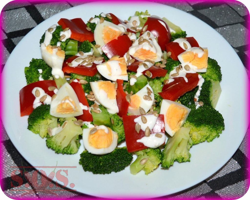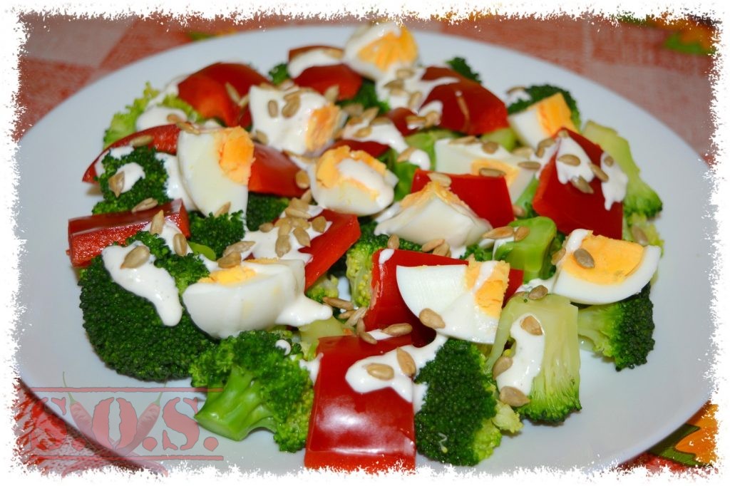 Brokuł, jajko na twardo, papryka i ziarna słonecznika – z tych prostych składników powstała sałatka dla gości, a raczej sąsiadów, którzy wpadli do nas na kawę i… coś mocniejszego🙂 Przekąska spisała się świetnie! Znikła ze stołu raz dwa🙂 Sąsiadka nawet wspomniała, że robi podobną sałatkę, tylko z pomidorem zamiast papryki. Przepis na sałatkę pochodzi od DiamondAngelTV (filmik). Jest smaczna i ładnie wygląda – świetna, nie tylko na wizytę gości, ale też na lekką kolację, przekąskę lub imprezę.