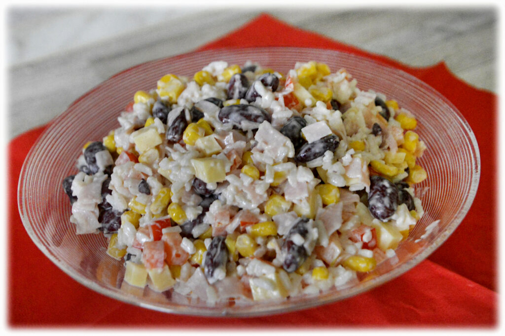 Ryż ugotuj według instrukcji na opakowaniu – odsącz z wody, pozostaw do ostygnięcia. Fasolę i kukurydzę odsącz z zalewy, a szynkę, ser i paprykę pokrój w kosteczkę. Przełóż je do większej miski. Dodaj ryż, majonez oraz keczup. Dopraw przyprawami – całość dobrze wymieszaj. Odstaw do lodówki na około 20 minut, by składniki się przegryzły.