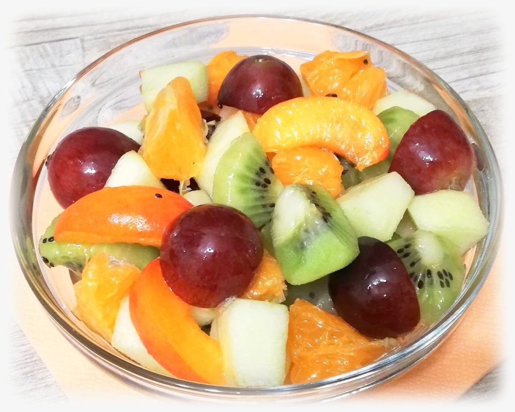 Według mnie jest jeszcze smaczniejsza, gdy gotową sałatkę odstawi się na dłużej (około 4-5 godzin). Przez ten czas z owoców wycieknie jeszcze więcej soku i wszystkie składniki się ze sobą „przegryzą”.