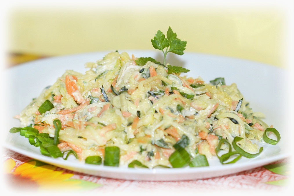 Jeśli jeszcze nie jadłeś cukinii na surowo, polecam przygotowanie do obiadu tej sałatki🙂 Smaczna! Soczysta! Prosta w przygotowaniu! Zrobiona z cukinii, marchewki, jabłka i szczypiorku. Sprawdzi się jako dodatek do drugiego dania, do potraw smażonych, pieczonych oraz z grilla.