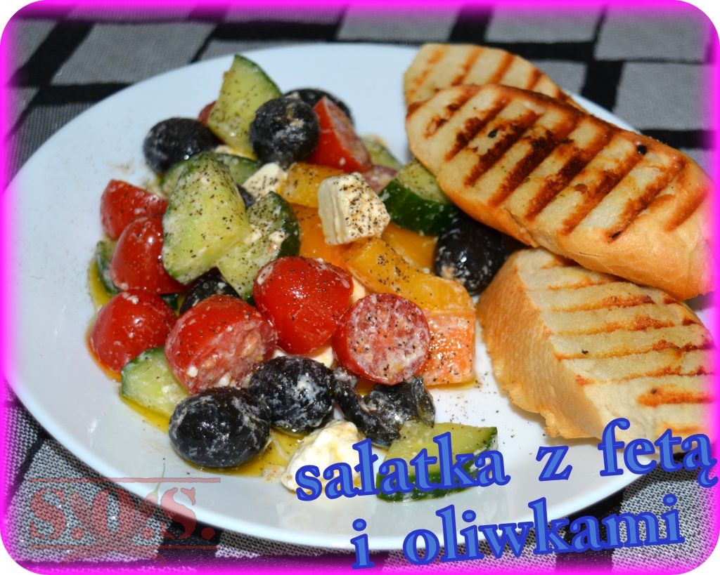 Pomidorki opłucz, osusz i przekrój na pół. Paprykę i ogórka umyj, a następnie pokrój w duże kawałki. Wrzuć je do miski razem z pomidorkami, oliwkami odsączonymi z zalewy i serem pokrojonym w dużą kostkę. Polej po wierzchu oliwą, posyp szczyptą soli, pieprzu i ziołami włoskimi. Całość delikatnie wymieszaj przy pomocy dwóch łyżek. Przechowuj w lodówce.
