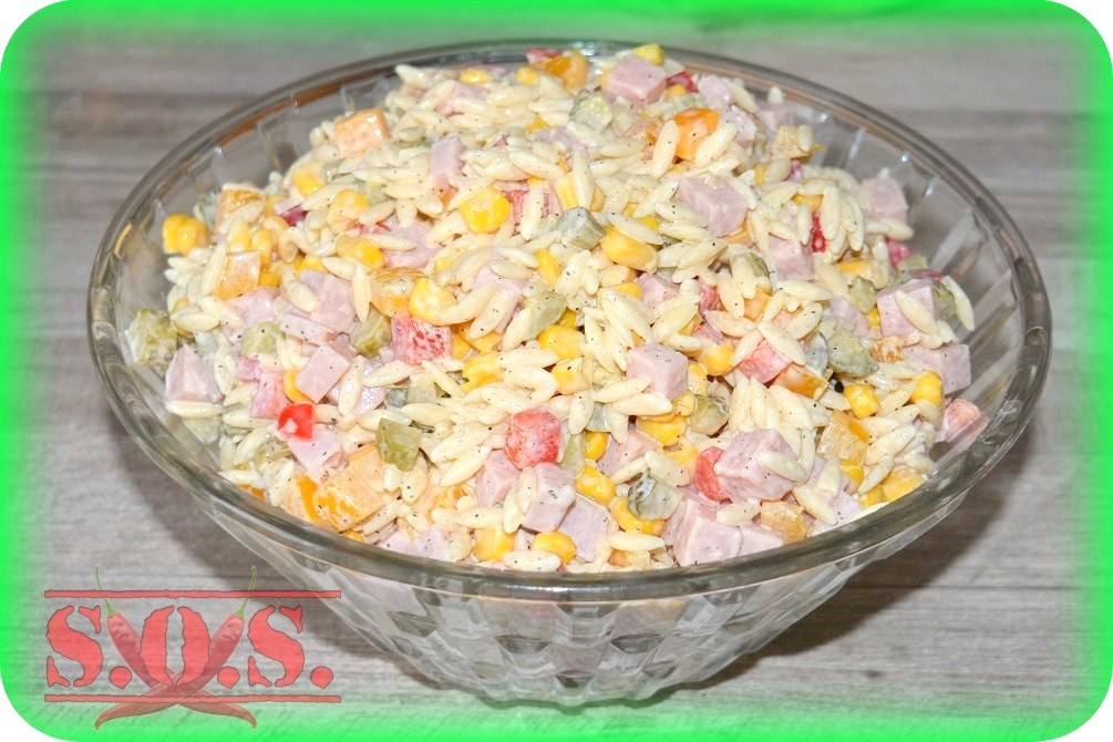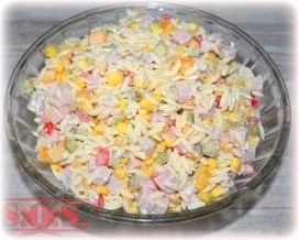 Makaron ugotuj według przepisu na opakowaniu. Odstaw do wystudzenia. Kukurydzę odsącz z zalewy. Szynkę, papryki i ogórki pokrój w dużą kostkę. Wszystkie składniki przełóż do dużej miski, wymieszaj z majonezem. Dla smaku przypraw solą i pieprzem.