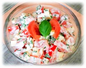 Prosta i bardzo smaczna sałatka, którą można przygotować na śniadanie, obiad, kolację lub jako dodatek do grillowanych dań🙂 Doskonale pasuje do pieczywa, wędlin, ryb oraz mięs.