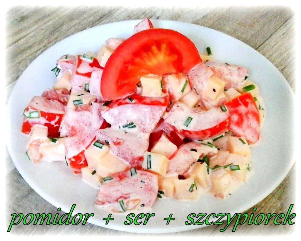 Pomidory pokrój w dużą kostkę, a ser w drobną kosteczkę. Szczypiorek posiekaj. W misce połącz wszystkie składniki z majonezem. Dopraw do smaku solą i pieprzem. Podawaj zaraz po przygotowaniu lub przechowuj w lodówce.