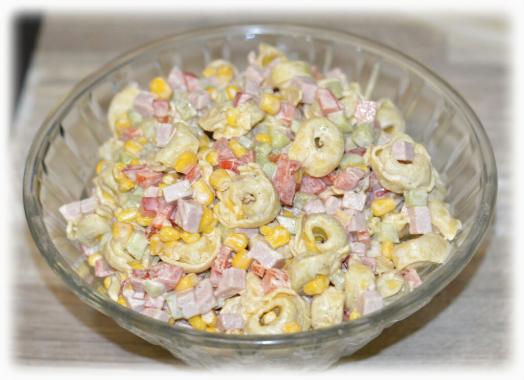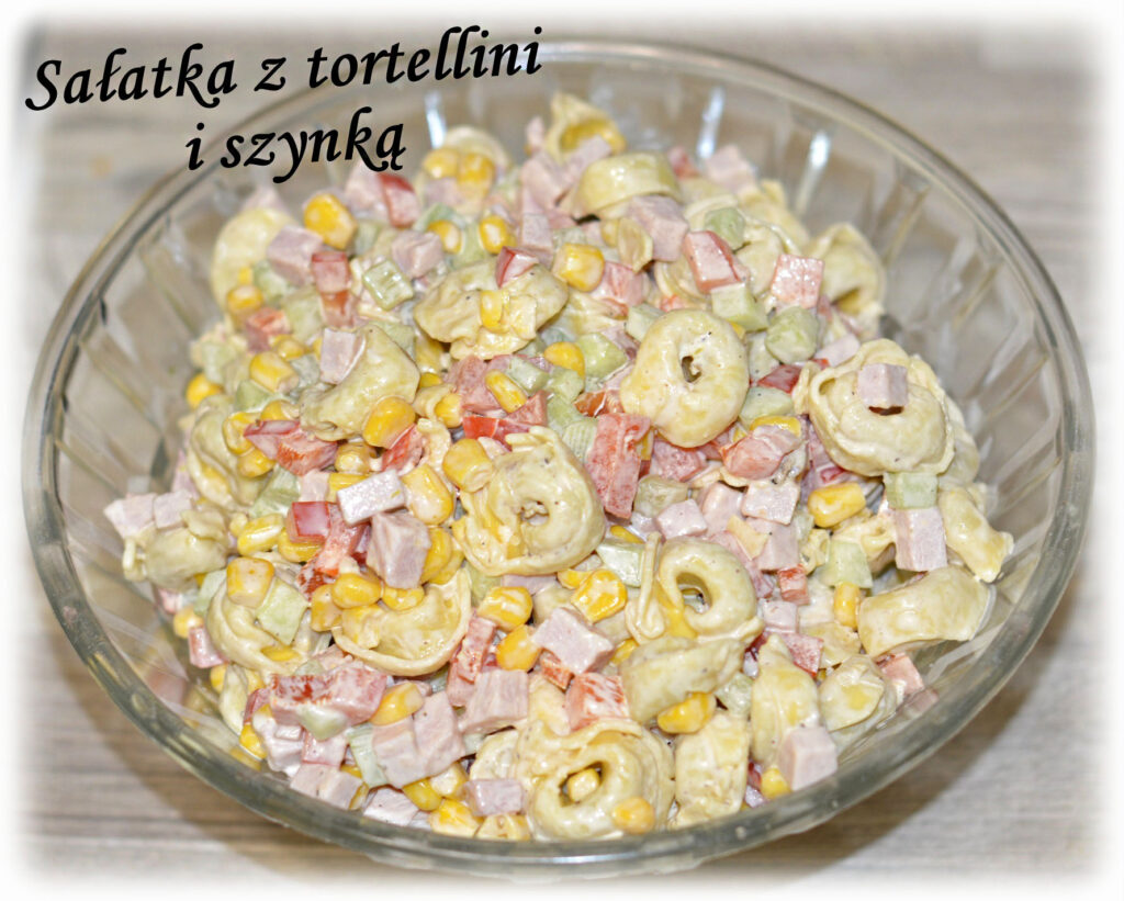 Tortellini ugotuj według instrukcji na opakowaniu, następnie przełóż do durszlaka, odcedź, pozostaw do przestygnięcia. Pokrój w kosteczkę szynkę, ser, obrany ogórek i paprykę. Przełóż je do miski, dodaj tortellini oraz odsączoną kukurydzę. W kubku wymieszaj majonez, jogurt, czosnek przyciśnięty przez praskę, sól, pieprz. Dodaj sos do pozostałych składników – całość dobrze wymieszaj, ewentualnie dodatkowo dopraw. Gotową sałatkę możesz podawać od razu, ale polecam odstawienie do lodówki na kilka godzin (składniki się przegryzą i sałatka będzie lepsza w smaku).