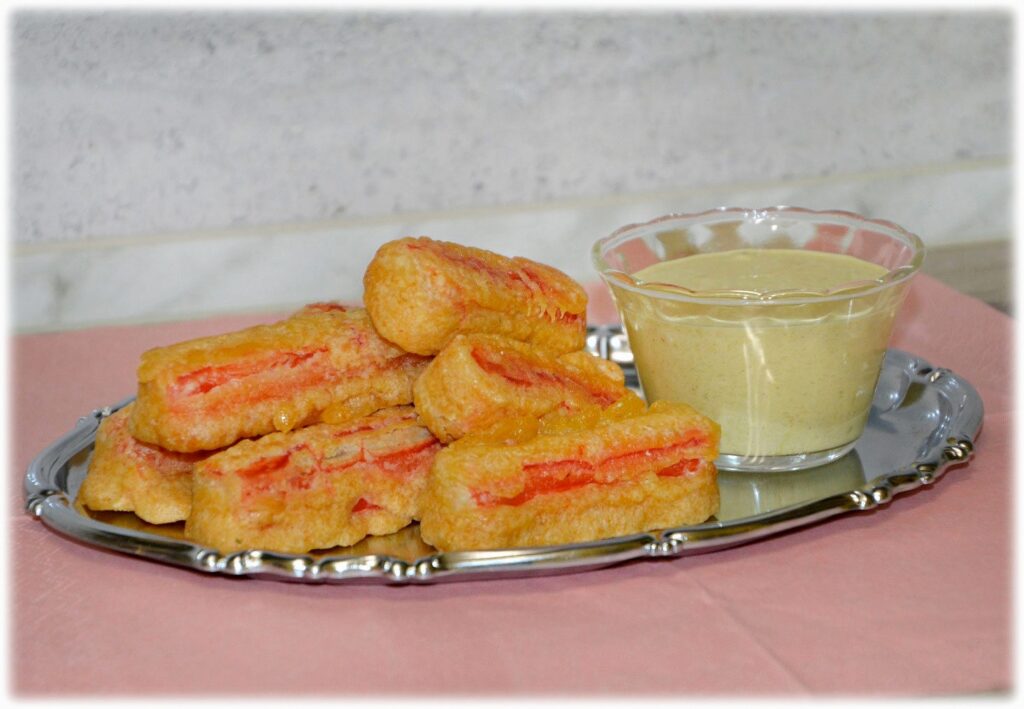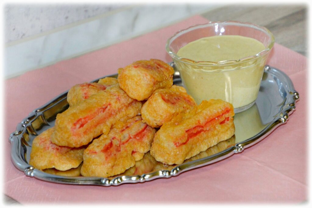 Krabowe kąski – apetycznie złociste, smaczne i bardzo sycące😉 Dzięki smażeniu paluszki stają się delikatniejsze w smaku. Mogą być świetną przekąską dla rodziny i dla gości. Dobrze smakują z keczupem lub ulubionym zimnym sosem (np. czosnkowym, pomidorowym, curry).