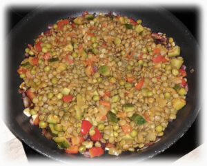 Soczewicę wsyp do małego rondelka, zalej 2 szklankami wody i gotuj do miękkości (ok. 15-20 minut). Po ugotowaniu przelej całość na sito, by odsączyć soczewicę. Na patelni rozgrzej olej, wrzuć pokrojoną cebulę – smaż, aż się zeszkli. Następnie dodaj pokrojoną paprykę, cukinię, odsączony groszek – przykryj pokrywką i duś przez chwilę. Wsyp soczewicę oraz przyprawy. Na koniec wlej do warzyw skrobię ziemniaczaną rozmieszaną w 1/3 szklanki zimnej wody. Całość wymieszaj – duś jeszcze około 3-4 minuty, by sos warzywny nieco zgęstniał… i gotowe😊