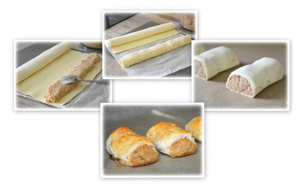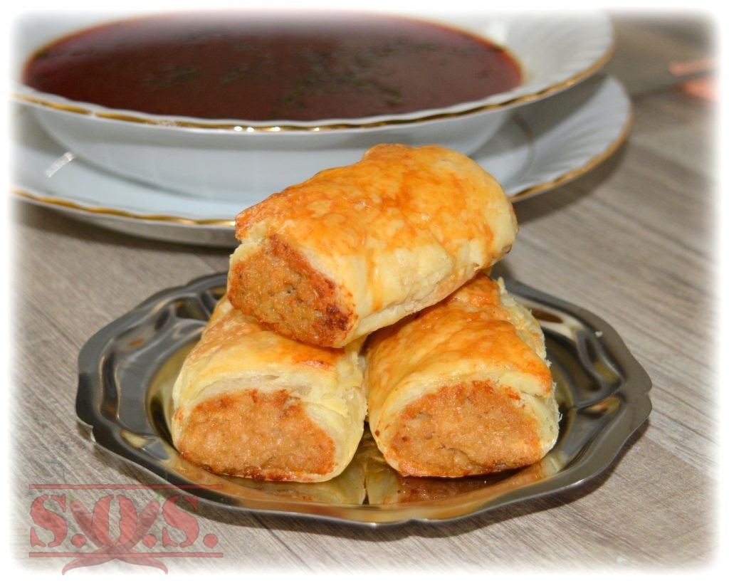 Z cebuli usuń łupinę, pokrój ją w kostkę i zeszklij na maśle. Następnie zmiel w maszynce do mielenia lub rozdrobnij w malakserze razem z mięsem. Do masy dodaj sos sojowy i całość wymieszaj. Ciasto francuskie rozwiń. Ułóż podłużnie farsz zaczynając od brzegu, zwiń tworząc długi rulon i odetnij nadmiar ciasta. Poprzecinaj go na kawałki kształtując paszteciki. Ułóż je na blasze wyłożonej papierem do pieczenia. Piecz w temp. 220 stopni przez ok. 15-20 min, aż się zarumienią.