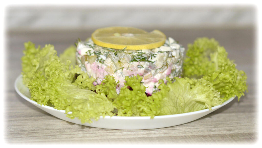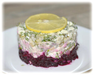 Tatar ze śledzia z dodatkiem majonezu😉 Bardzo smaczna potrawa, która doskonale sprawdzi się na co dzień jako przekąska oraz na imprezach i przyjęciach. Śledziową sałatkę ułożyłam na spodzie z buraczków, ale jeśli chcesz, możesz wszystkie składniki razem wymieszać – wtedy tatar będzie różowy😉 Użyte buraczki mogą być ugotowane w skórce lub upieczone (będą mieć ciemny wyrazisty kolor). Możesz także wykorzystać te, które pozostały z ugotowania czerwonego barszczu.