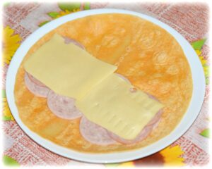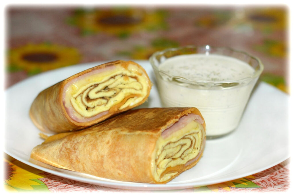 To nic innego, jak tortilla z wędliną, serem i omletem. Pyszna i bardzo sycąca – w sam raz na śniadanie. Świetnie smakuje podana z zimnym sosem, np. czosnkowym, musztardowym, pomidorowym, bazyliowym😉