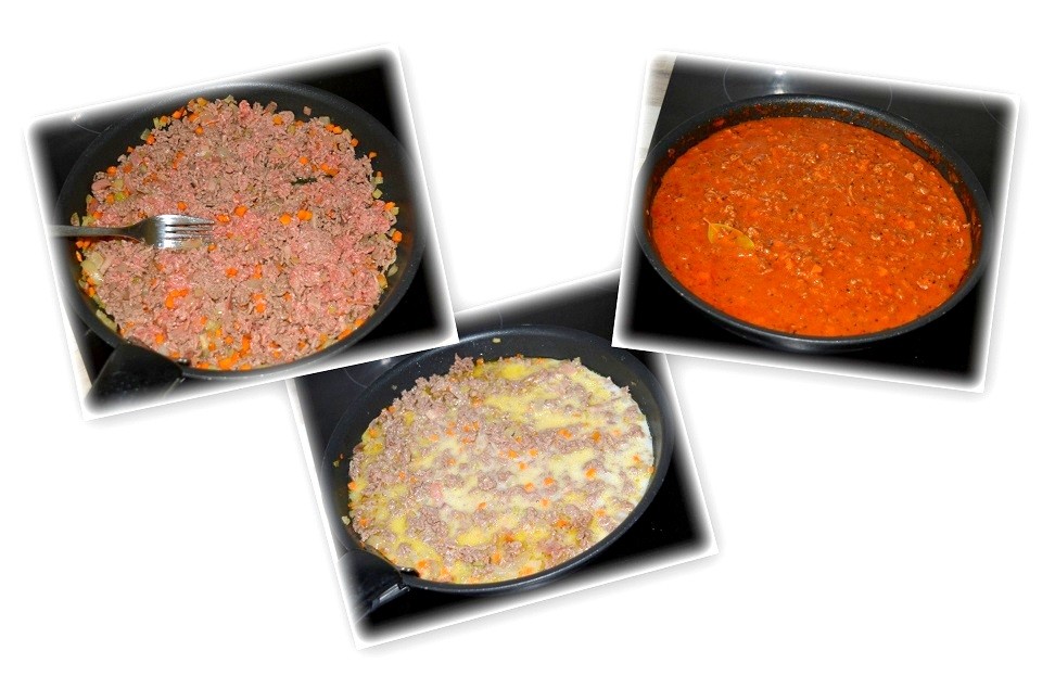 Gałązki selera, cebulę, marchewkę oraz boczek pokrój w drobną kostkę. W głębokiej patelni lub rondelku rozgrzej tłuszcz, wrzuć pokrojone składniki i smaż przez ok. 5 minut. Dodaj mięso mielone. Smaż je przez 5-10 minut, aż straci surowy wygląd. W czasie smażenia rozdrabniaj je rozgniatając widelcem. Dodaj wino, przecier pomidorowy i listki laurowe – gotuj przez ok. 25-30 minut, po czym wlej mleko. Ja całość gotowałam na najmniejszym ogniu (sos lekko pyrkał) około 40 minut, ponieważ uznałam, że zgęstniał wystarczająco. W oryginalnym przepisie, powinien się gotować ok. 2-4 h, ponieważ wtedy bardziej zyskuje na smaku. Na końcu doprawiłam solą i pieprzem.