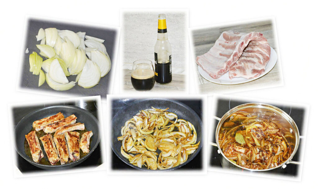 Żeberka umyj i osusz. Z obu stron obficie obsyp mięso przyprawą, wetrzyj ją dłońmi i porozcinaj na mniejsze kawałki (z jedną lub dwiema kostkami). Obsmaż je, a następnie przełóż żeberka do rondelka. Na tym samym oleju zeszklij pokrojoną w piórka cebulę. Również przełóż ją do rondla wraz z tłuszczem z patelni. Wlej piwo, dodaj liście laurowe oraz ziele angielskie. Duś pod przykryciem około 1 godzinę mieszając od czasu do czasu. Po godzinie mięso powinno być już miękkie. Posmakuj sosu i ewentualnie dopraw go dodatkowo solą oraz pieprzem. Smacznego!😉