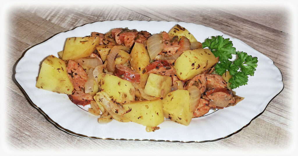 Ziemniaki obierz, opłucz i pokrój w kostkę (najlepiej o bokach 1-2 cm). Kiełbasę pokrój w plasterki lub półplasterki, a cebulę w piórka. Wszystkie składniki wrzuć do foliowego rękawa lub woreczka do pieczenia. Dodaj zioła i przyprawy. Zepnij spinaczem i poobracaj woreczek w dłoniach, by przyprawy pokryły wszystkie składniki. Włóż do rozgrzanego piekarnika i piecz około 45 minut w temperaturze 180 stopni.