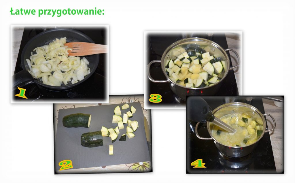 Obraną cebulę pokrój i zeszklij na maśle (na patelni lub od razu w rondlu, jeśli ma grube dno). Do rondla wrzuć obrane i pokrojone w kostkę ziemniaki oraz cukinię, zalej bulionem i zagotuj. Gotuj ok. 20 minut, następnie zmiksuj blenderem na krem (no chyba że masz termomix🙂). Pod koniec dopraw solą oraz pieprzem oraz dodaj śmietankę.