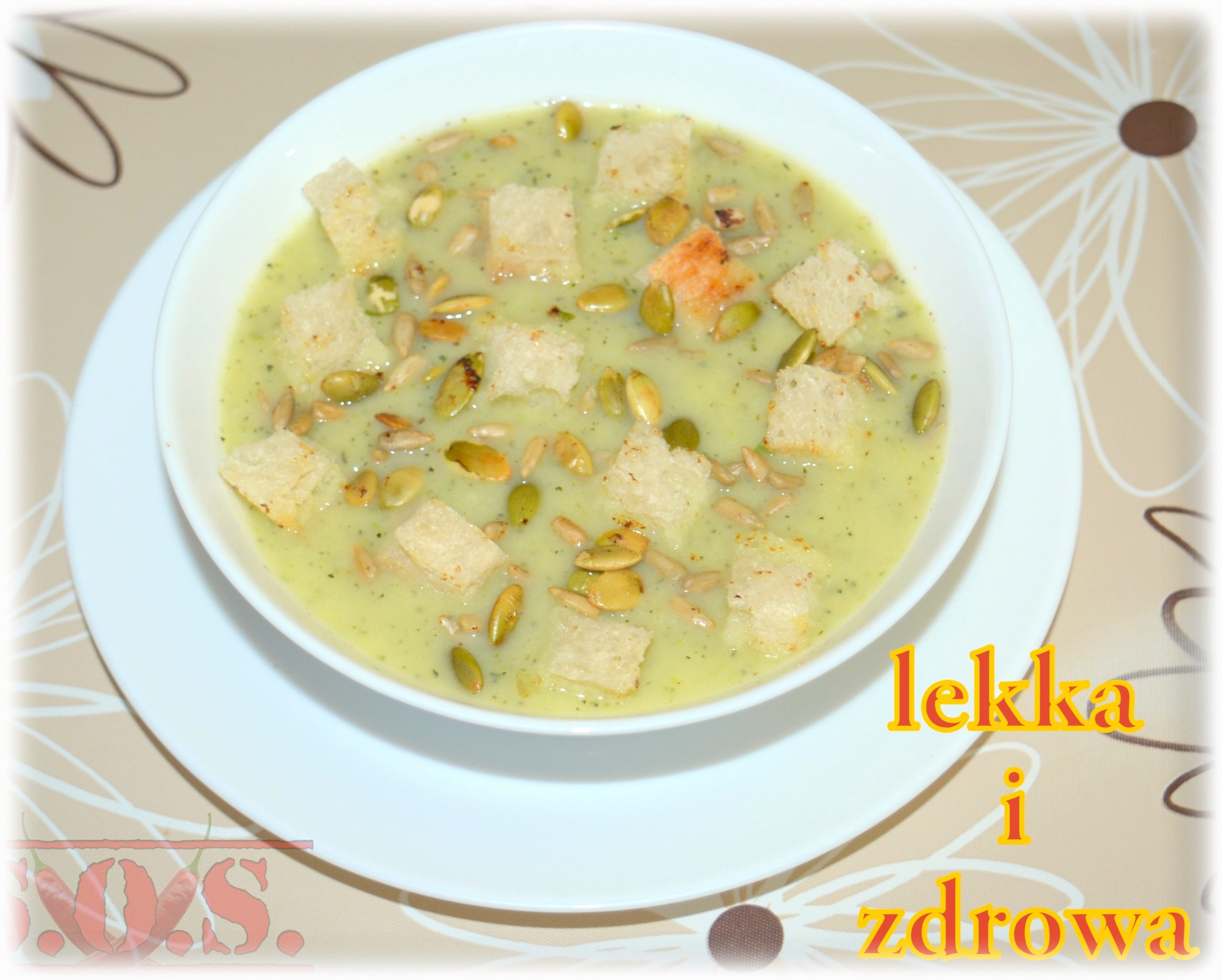 Zwykle moje cukiniowe zupy wyglądały tak, że do gara wrzucałam kawałki cukinii razem z miksem innych warzyw. Tym razem po raz pierwszy postanowiłam zrobić krem z cukinii. Zupa się udała znakomicie – gęściutka, kremowa, pyszna🙂 Wspaniale smakuje z pieczywem, ale też polecam chrupiące grzanki oraz prażone ziarna dyni i słonecznika.