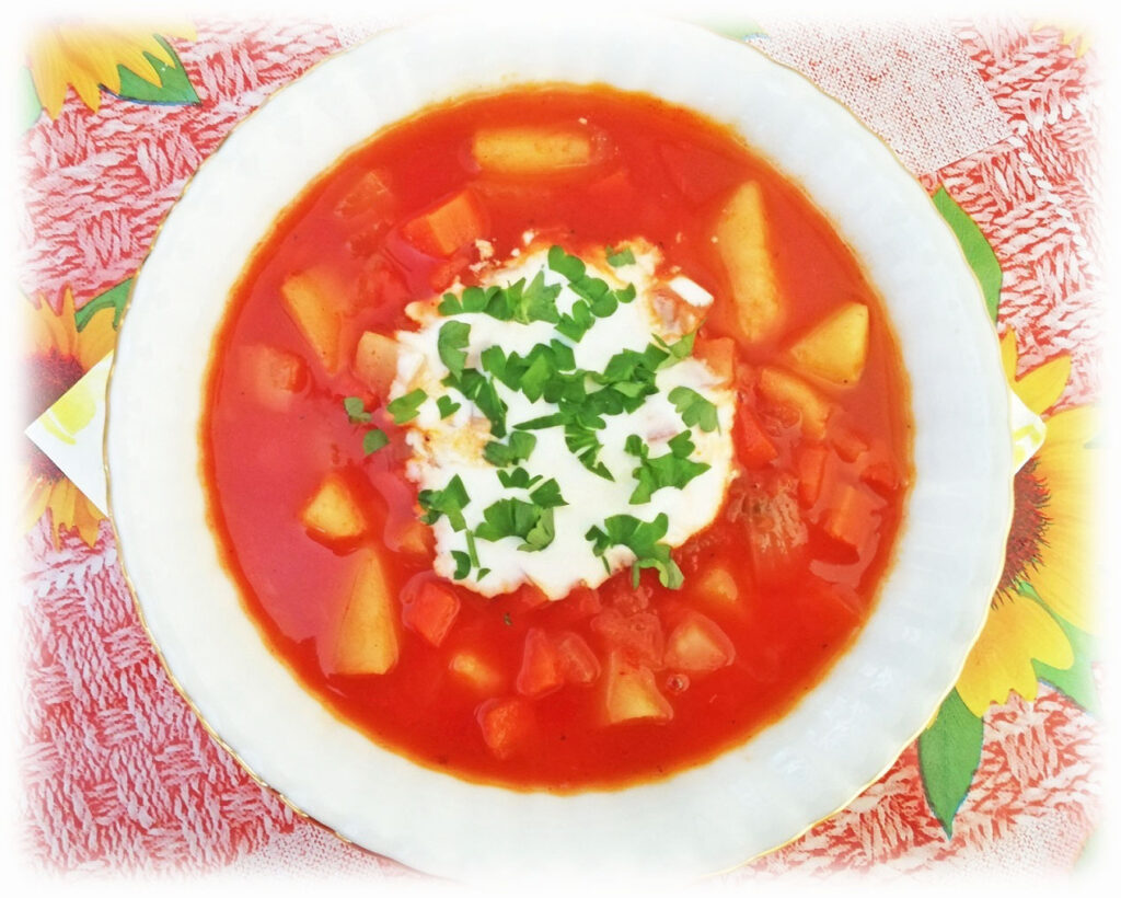 Obierz i pokrój marchewkę, korzeń pietruszki, seler oraz ziemniaki. W garnku rozgrzej oliwę, wrzuć posiekaną cebulę i czosnek przeciśnięty przez praskę – zeszklij. Wlej bulion. Dodaj pozostałe warzywa, liście laurowe, ziele angielskie. Gotuj do miękkości warzyw (około 15-20 minut). Dorzuć pomidory oraz przyprawy. Trzymaj na ogniu jeszcze 10 minut i gotowe. Podawaj z kleksem gęstej śmietany.